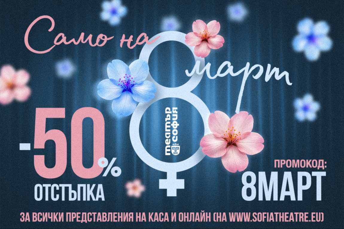 💻 и онлайн с промокод 8МАРТ, като се регистрирате на https://sofiatheatre.eu/ и въведете промокод 8МАРТ (изписан с главни букви).