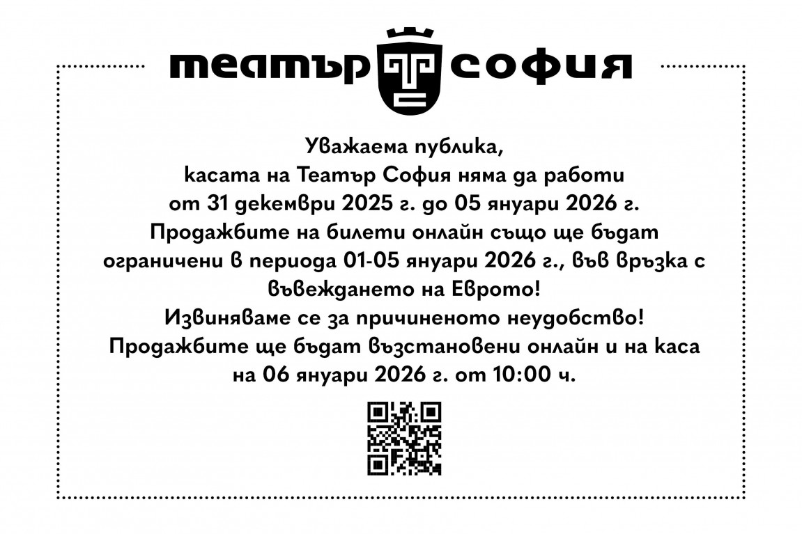 касата на Театър София няма да работи от 31 декември 2025 г. до 5 януари 2026 г.