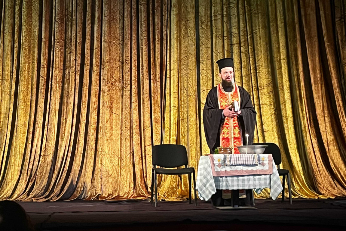 Отец Никола Чочев от Столичния храм „Света Неделя“ благослови служителите на театъра и зрителите, с пожелания за много здраве, вяра и радост през новата 2026 година.