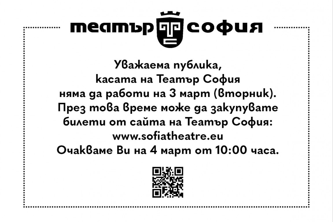 касата на Театър София няма да работи на 3 март (вторник).